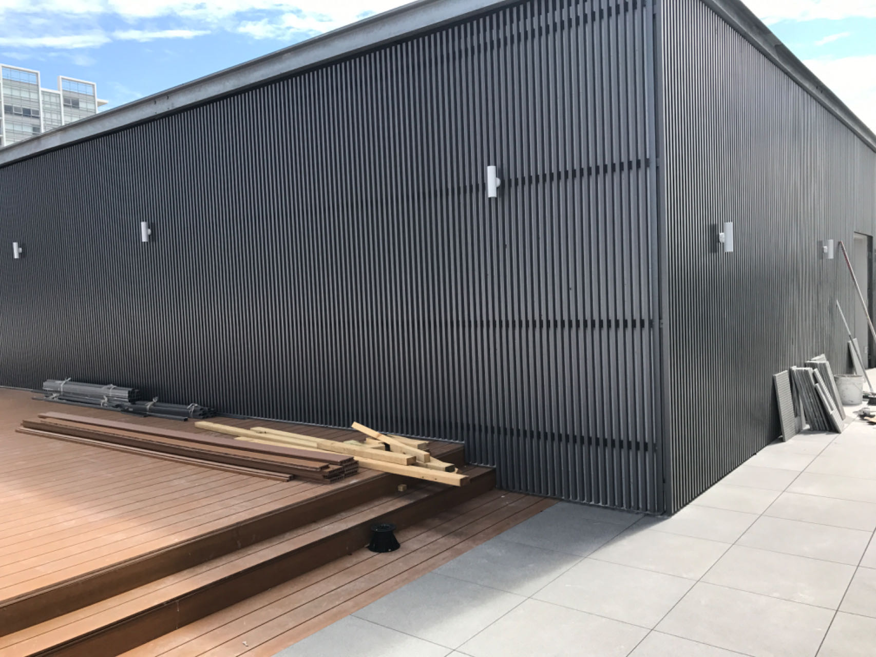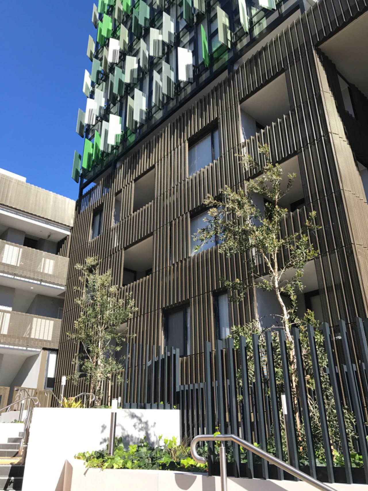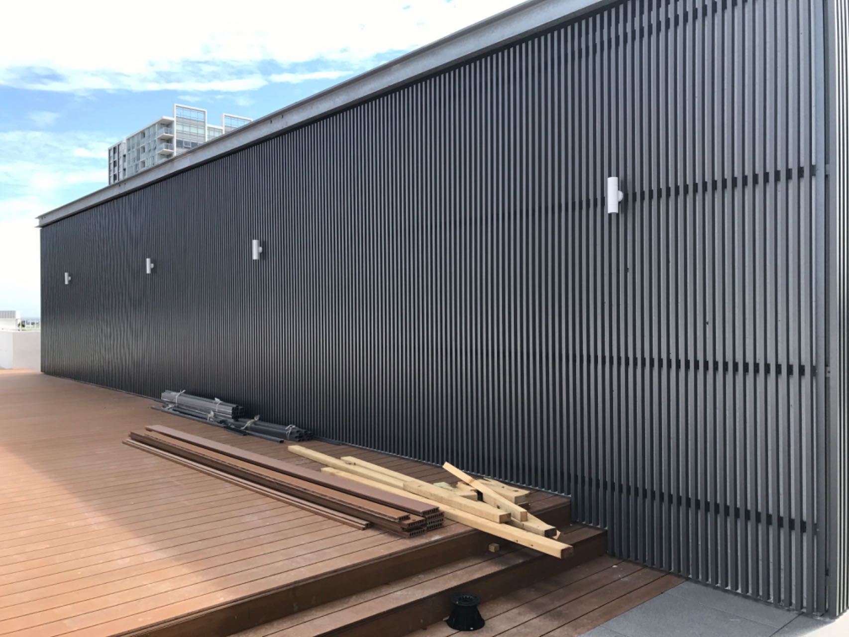 Perforated & ribbed aluminium wall cladding, metal balustrade, metal fence & gates, aluminium cladding, structural steel awning, aluminium batten wall cladding, SS handrails etc